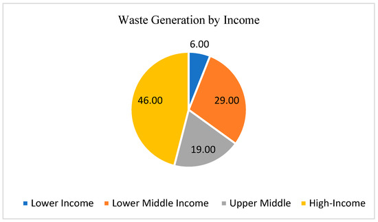According to the World Bank [1], although there are significant variations in waste generation by region, waste generation can be viewed as a function of wealth. A report estimated that in 2018, global waste generation stood at 2.01 billion tonnes per year. However, this is expected to increase to 3.4 billion tonnes per annum by the year 2025. Generally, it can also be observed that areas with higher rates of urbanisation and economic development tend to have a greater amount of solid waste generation compared to areas with lower rates of economic development. Factors such as local climate and public habits also influence waste generation rates [25]. This trend can clearly be observed in Figure 1, which illustrates the percentage of waste generated by lower, lower middle, upper middle, and high-income countries in the world. Tchobanglous G. et al. [26] identified seven key issues that need to be considered in discussing solid waste management.