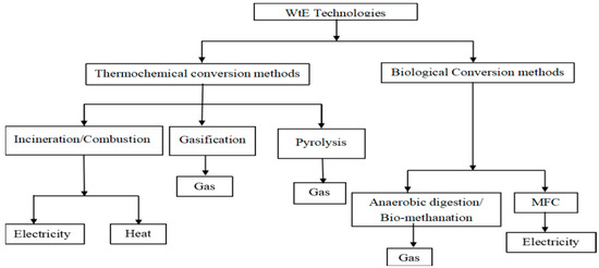 WtE technologies can broadly be classified into two types, namely, thermochemical and biological conversion methods. Figure 4 is a flowchart of the various methods of WtE technologies including the useful energy that can be derived from each technology.