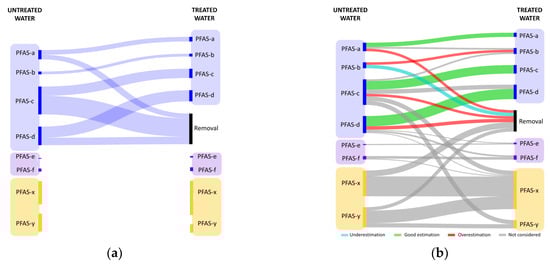 Sankey diagram of a fictional case study, in which the effectiveness of a technology is evaluated. Blue indicates known and investigated PFASs, violet represents known but not investigated PFASs, while yellow indicates unknown PFASs. Fluxes that can be estimated in case of (a) the “chemical only” assessment are compared to (b) a real situation. The legend refers to the comparison of the current approach with respect to the real condition.