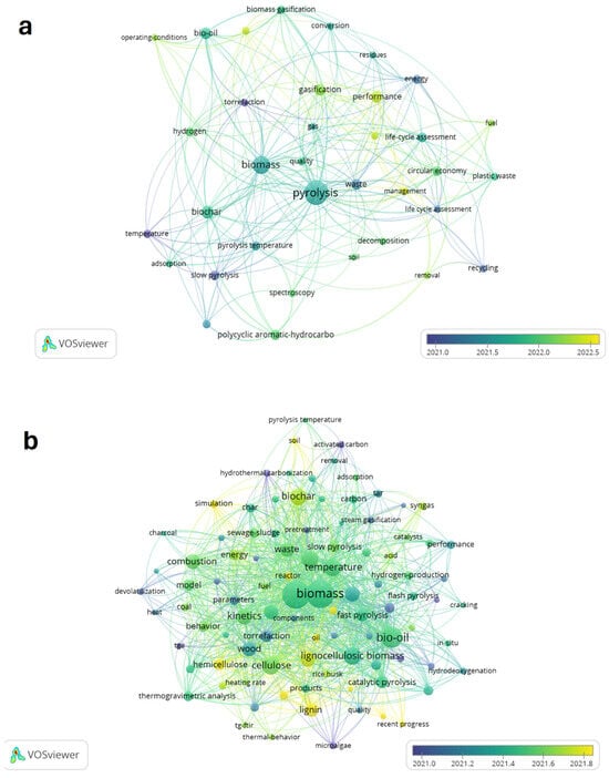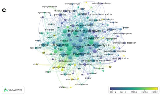 Keyword diagram generated in VOSViewer for search equations: (a) Pyrolysis and Europe; (b) Pyrolysis and Biomass; (c) Pyrolysis and Plastic Waste.