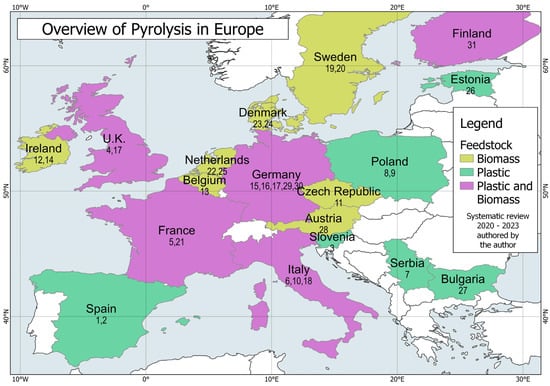 In the face of this context, this paper aims to present a comprehensive review of the research conducted on pyrolysis in Europe from 2020 to 2023. Through an analysis of published studies, our aim is to synthesize the key findings, highlight notable advancements, and identify emerging research trends. Furthermore, this review will shed light on some of the key challenges encountered and propose potential areas for future research and innovation. Thus, the primary objectives of this scientific work were as follows: (1) to identify the overarching themes regarding key pyrolysis studies conducted in Europe through a literature review; (2) to provide detailed insights into the major works, aiming to construct a comprehensive map of Europe for the easy identification of countries and their prevalent research trends; (3) to conduct a critical analysis, delving more deeply into topics that emerged with greater frequency during the review. In this manner, the results can serve as a valuable resource for future research in pyrolysis, as well as for the scaling-up and rapid deployment of processes for specific industrial applications.