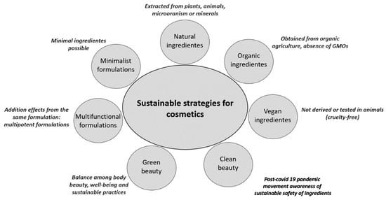 This trend has generated a preference for the use of renewable products, and if possible, with all ingredients derived from natural sources—biocosmetics [3]. New labels are used to better suit consumers’ expectations of cosmetics regarding sustainable practices (Figure 1). In general, people with higher education are more worried about environmental problems related to the use of cosmetics; however, most consumers are not willing to pay more for a product that has sustainable ingredients [4]. Additionally, after the COVID-19 pandemic, a healthier life perspective has arisen, opening novel opportunities for the cosmetic industry, especially focusing on the circular economy [3,5]. Interestingly, the main drives for the beauty and personal care industries post-COVID-19 are reinforcing the skin barrier, immunity and anti-inflammatory boost features, good sustainability practices during manufacturing, local supply chain priority, upcycling cosmetics-food industries, sustainable and biodiversity-friendly ingredients, social and multicultural inclusivity, digital retailing, and healthy-related products [3].