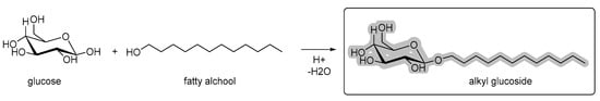 Ingredients used in the formulation for sensory and stability issues may also be plant-based. Emulsions and foams require surfactants to remain stable, avoiding phase separation and ensuring adequate shelf life. Currently, most of the surfactants used are synthetic or semi-synthetic compounds (e.g., tweens, spans, or sucrose esters). However, with the trend to increase sustainability in industrial production, biosurfactants, having a renewable origin, were created. These are biocompatible and biodegradable derivatives [24] and have the advantage of being absorbed gradually [25]. Alkyl glycosides, for instance, are completely biodegradable surfactants that can be produced from a reaction of fatty alcohols from coconut or palm trees with glucose (Figure 3). These can be used to emulsify formulations, form quality foam, and may have cleaning properties [26]. Alkyl glycosides are highly stable and environmentally friendly. These are produced from the condensation of sugar with a fatty alcohol, which determines its size. Fatty alcohols can be extracted from several plant sources, including potatoes, corn, and coconut. Currently, its use is related to several products, such as shampoos, soaps, deodorants, sunscreens, and moisturizing creams, among others [27].