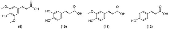 Chemical structures of sinapic acid (9), caffeic acid (10), ferulic acid (11), and coumaric acid (12).
