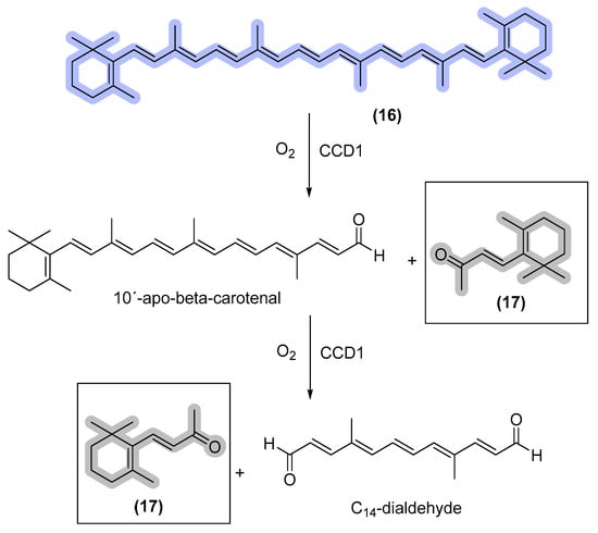 Schematic representation of β-ionone biosynthesis. CCD1 = carotenoid cleavage dioxygenases; β-carotene (16); and ionone (17) [51].