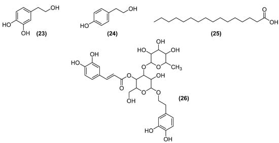 The olive tree (Olea europaea L.) is a determinant of olive oil production. More than 8 million hectares are occupied by this species [102], and since the market for its derivatives is growing, consequently, waste production is also increasing [103]. Its residues (especially leaves) have potential compounds for the cosmetic industry, such as hydroxytyrosol (23), with antioxidant and inhibitory action of melanin production, avoiding the formation of spots on the skin; tyrosol (24), showing antioxidant and anti-inflammatory activities; palmitic acid (25), a fatty acid acting as a moisturizer; beta-carotene (16), an antioxidant, anti-inflammatory, and regenerating agent of the epidermis; and verbascoside (26), a glycoside with antioxidant and anti-inflammatory activity. These compounds can be obtained by nanofiltration or reverse osmosis, and some of the chemical structures can be seen in Figure 10 [104].