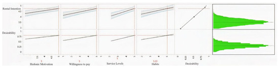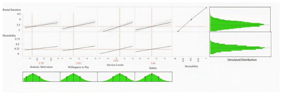 This research also conducted a Monte Carlo simulation on the model to understand the overall distribution and trend of the rental intention. The desirability function (Figure 1) assigns a numerical value to outcomes based on how closely they meet a particular goal or objective. In scenarios where there are multiple outcomes to consider in this research, and these outcomes may have conflicting requirements, desirability functions become very useful. This is because they allow for combining and balancing these outcomes in a standardized way. The rental intention has four attributes to consider. Figure 2 adjusts the hedonic motivation, willingness to pay, and service level to be as high as possible, while the construct habits has a wider range, indicating the resilience of this regressor. The habits variable needs extra weight to push the rental intention to the upper boundary. The desirability of this paper provides a structured way to navigate and optimize complex situations with multiple, potentially conflicting objectives. Notably, EV rental users present a distinct array of difficulties, predominantly attributable to the fleeting nature of rental exchanges and the heterogeneous demographic composition. Survey data collection can be challenging due to the transient and frequently irregular utilization patterns exhibited by these vehicles. Moreover, the demographics of rental EV users are diverse, including those who are acquainted with technology, socioeconomic standing, and age, which further complicates the standardization of survey methodologies. Utilizing a Monte Carlo simulation offers significant value in this particular context. Researchers have the ability to simulate an extensive range of potential outcomes. The green distributions in Figure 1 and Figure 2 deduce patterns, detect possible anomalies, and provide a more holistic understanding of the attitudes and inclinations of rental EV users by depicting that the adoption of rental EVs is still not extremely strong but somehow increased. As a result, the curve is a leptokurtic distribution with high kurtosis, indicating people want to give rental EVs a try but are not fully committed.