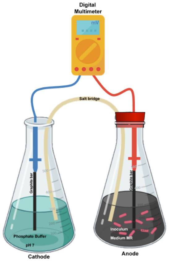 The salt bridge solution [35,36] was made up of a solution of 35 g of KCl, diluted in 100 mL of phosphate buffer (pH 7) and agarose (10%) as a solidifying agent, sterilized in an autoclave (15 min, 105 °C and 1 atm), then carefully poured into glass tubes of 25 mm diameter and 200 mm length in a U shape for solidification.