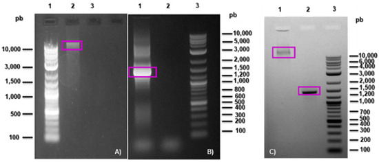 (A) Agarose gel 1%, 1 DNA ladder 10 Kb, 2 Genomic DNA, (B) agarose gel 1%, 1 product of PCR 1500 pb, 3 DNA ladder 10 Kb, (C) agarose gel 1%, 1 Genomic DNA, 2 product of PCR 1500 pb purified, 3 DNA ladder 10 Kb.