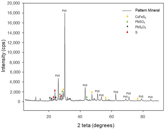 For the obtained diffraction pattern, PbS was identified as the major component in mineral species such as galena with 77% abundance (Table 2). Other sulphur species identified were CuFeS2 (chalcopyrite), PbSO4, FeSO4, Pb(S2O3), and S (Figure 3).