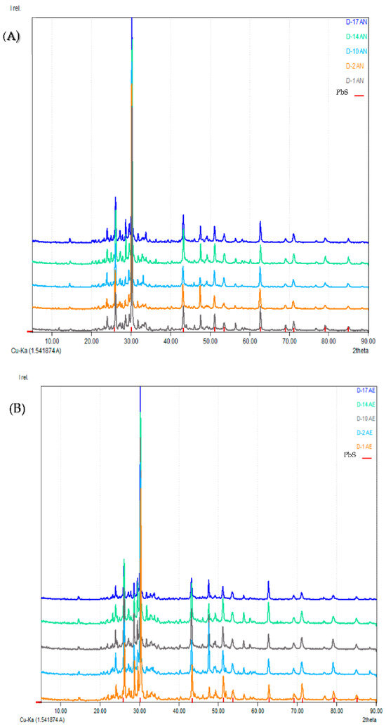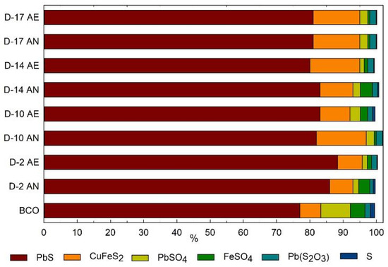 The variation in the intensity of the peak pattern identified for galena is attributed to the change in concentration of the species as shown in Figure 5A,B, where the diffraction pattern was identified under anaerobic conditions corresponding to PbS with greater intensity at time 10. This possibly occurred due to the decrease in the concentration of components such as sulphur, where it was possible to identify the reduction in the intensity of the peak pattern corresponding to the sulphur of D-17 concerning the diffraction pattern of D-2. For aerobic conditions, the intensity of the peak pattern decreased for compounds such as PbSO4 and S, at all times. However, the diffraction pattern identified for PbS suffered an increase for D-10, which could be attributed to the use of other compounds present in the mineral, which increases the proportion of PbS in the solid sample, which could be evaluated according to the concentration (%) of the components present in the sample (Figure 6).
