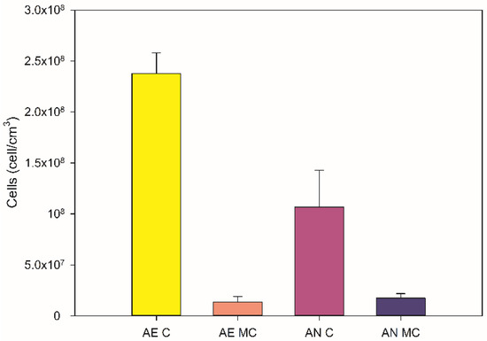 Sessile cell density under experimental design conditions at 400 h in graphite bar (AE: atmospheric conditions, AN: CO2 purged, C: mineral concentrate, MC: culture medium).