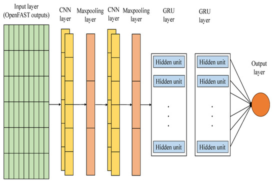 Figure 2), engineered to forecast the dynamic behavior of spar-type FOWTs. The choice of CNN and GRU models over other ML models was owing to their unique strengths and capabilities in processing and predicting time series data. The CNN layers extract relevant features from the input data, and the GRU layers process these features to recognize and predict complex long-term patterns in the dataset, which are crucial for the objectives of this study. The development process including the architecture of the model, preparation, and preprocessing of the dataset is presented in the following subsections.