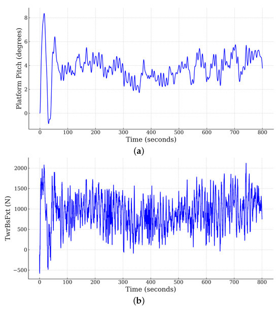 Figure 4, “PtfmPitch” represents the platform pitch, indicating the tilt of the platform; “TTDspFA” refers to the initial fore-aft displacement at the tower-top; “RotThrust” denotes the rotor thrust, which is the force exerted by the wind on the turbine’s rotor. “YawBrFxp” measures the fore-aft shear, side-to-side shear, and vertical forces at the top of the tower; “TwrBsFxt” captures similar forces (fore-aft shear, side-to-side shear, and vertical forces), but at the base of the tower. “TwrBsMyt” represents the side-to-side bending, fore-aft bending, and yaw moments at the tower base. “TwHt1MLyt” indicates the local side-to-side bending, fore-aft bending, and yaw moments measured at tower gage 1. “HydroMyi” is related to the hydrodynamic moment about the side-to-side motion axis. “B1Pitch” is the pitch angle of blade 1. Lastly, “B1HDSMyi” refers to the hydrostatic moment from the 1st WAMIT body about the global y-axis at the 1st WAMT body reference point. The example depicted in