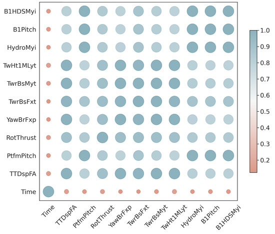 43]. The sampling frequency used in OpenFast simulations is tailored for the solver’s numerical stability. However, it may not be ideal for deep learning models and could introduce noise into the data. Therefore, to ensure predictions were not affected by noise and to effectively track the trends and dependencies in platform pitch, the data’s sampling frequency was reduced to 1 s. Subsequently, all output files were merged to form an extensive dataset for the deep learning model. An analysis of the correlation between power generation and other features was conducted to pinpoint features whose past values might be indicative of future power generation. This correlation study led to the selection of 9 features that showed a strong correlation with power generation, as depicted in