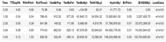 During the data preprocessing phase, the raw data must be converted into a format appropriate for analysis. The dataset employed to train and test the deep learning model consisted of 392 OpenFAST simulation outputs. Running each simulation for 800 s resulted in an output shape of . All the simulations were conducted on OpenFAST 5 MW OC3Spar test code, which was pre-validated with measured data from the OC3 Hywind project, and all additional corrections were applied to this test model to perfectly match the actual data obtained from full-scaled spar wind turbine on-site measurements.