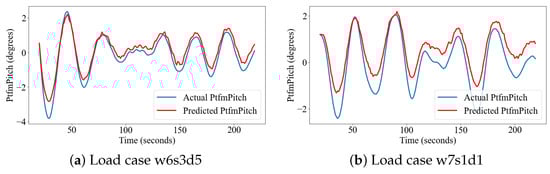 Figure 9, showcase the model’s exceptional skill in accurately reflecting intricate trends and relationships within the features. In naming the load cases, the number following ‘w’ denotes the wind field number, the number after ‘s’ indicates the sea state, and the number following ‘d’ represents the direction number. For instance, ‘w1s2d1’ refers to a load case that employs the first wind field with a mean horizontal wind velocity of 10 m/s. This is combined with a sea state of two, characterized by significant wave heights of 0.67 m and a wave period of 4.8 s. ‘d1’ signifies that the horizontal inflow wind direction is at a −30-degree angle relative to the turbine hub’s central axis.