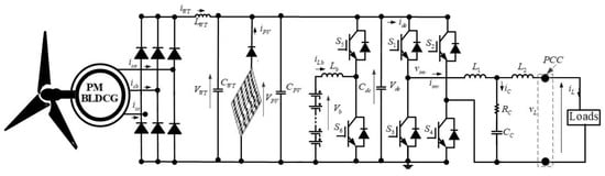 As it pertains to hybrid off-grid power converters, in [7], a DC-DC boost converter is used to connect the wind turbine (WT) based on PMBLDCG to the common DC link; however, the storage system is connected directly to the DC bus without using any interfacing power converter and control, and in [8], a three-phase diode bridge and DC-DC boost converter are used to connect the stator terminals of the PMBLDCG to the common DC bus. In [9], a DC-DC boost converter for WT based on PMBLDCG and batteries are connected directly to the common DC bus without any interfacing power converter and any control algorithm. In the same context, the authors in [10,11] propose two different configurations for the hybrid off-grid application, where in [10], the solar panels and the storage batteries are used as power converters, interfacing them with the DC bus; however, the stator terminals of the PMBLDCG are connected directly to the point of common coupling (PCC), which is on the load’s side, and in [10], the WT and solar panels use interfacing power converters, and the storage batteries are connected directly to the common DC bus. Connecting the batteries to the common DC bus as given in [7,9,11], can reduce their reliability and reduce their performance by reducing their lifespan. Furthermore, in all configurations [7,8,9,10,11], the WT either is connected directly to the PCC or through a DC-DC boost converter, which makes synchronization with the PCC difficult and increases the control and hardware complexity. Regarding the solar panels, all proposed hybrid off-grid configurations are interfacing with the DC bus through a DC-DC boost converter to avoid the synchronization issue and reduce the hardware and control complexity as well as increasing the battery performance and extending their lifespan.