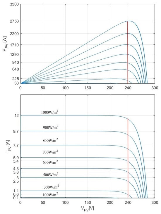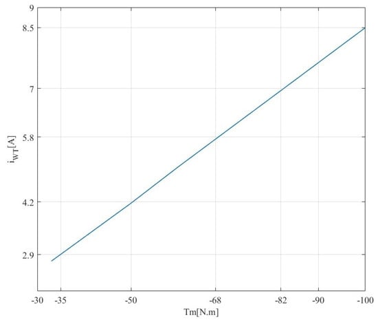 As demonstrated in Figure 2, for fixed DC-link voltage, the measured WT current is linear at the output of the TDB for different mechanical torques. Regarding the PVs, by connecting them in series to equalize the sum of their output voltages to the DC link voltage (i.e., 240 V) as shown in Figure 3, one can easily obtain good efficiency at a high level of solar irradiation and for moderate ambient temperature such as 25 °C.
