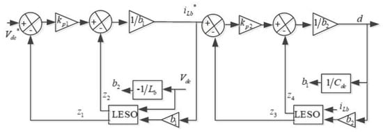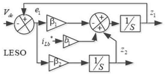 The model of the LESO used to estimate (, , , and ) in the outer and inner control loops shown in Figure 4 is detailed in Figure 5. The tracking value () and the disturbance () in the outer control loop are estimated using the following expression: