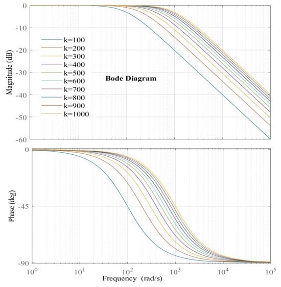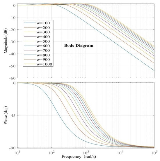 where s represents the Laplace operator. The Bode diagram of Equation (14) is shown in Figure 6 for different values of . It can be observed that the LESO acts as a low-pass filter. By increasing , the magnitude of the middle and higher frequencies increases, indicating enhanced disturbance estimation capability. By increasing the observer bandwidth, one observes smaller phase lags. Therefore, a higher value of results in a better disturbance estimation. However, when is increased, the high-frequency gain is also increased, which indicates that the LESO should be more sensitive to measurement noise. Consequently, a trade-off between disturbance rejection and sensitivity to noise measurement is needed when choosing the observer bandwidth of the LESO. An illustration of the Bode diagram of Equation (16) for different values of is shown in Figure 7. The controller bandwidth is similar to the coefficient given in Equation (10). As a result, if the linear state error feedback performs well, should be equal to . Using Equations (9) and (10), the disturbance is compensated, and one can define the transfer function as,
