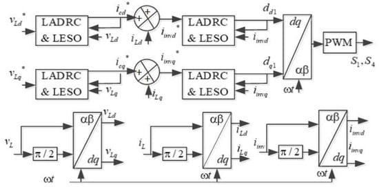 The control low () of the switches ( and ) of the FBSPI is determined by two control loops. In the cascade control system, two control loops are controlled using LADRC controllers with LESO. The output LCL filter’s capacitor current () in the d-q axis is estimated as follows: