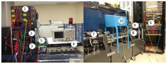 Hardware prototype: (1) current and voltage sensors, (2) buck–boost converter, (3) FBSPI, (4) solar photovoltaic emulator, (5) dSPACE and protection, (6) lead-acid batteries, (7) induction motor, (8) PMBLDC generator, (9) three-phase diode bridge, (10) speed and torque sensor, and (11) loads.