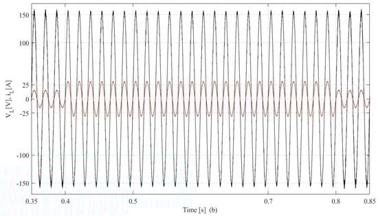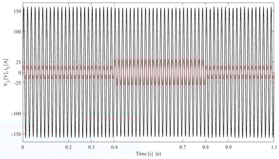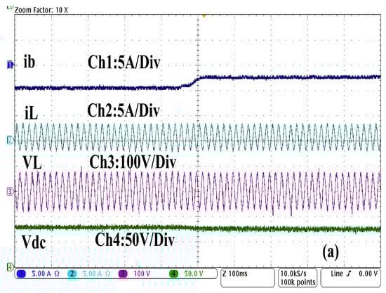 In Figure 10a, the waveforms of the PCC voltage (), and load current (), are demonstrated. The zoom of and from t = 0.35 s and t = 0.85 s is demonstrated in Figure 10b. The developed cascade control based on LADRC with LESO for the FBSPI is tested during a sudden increase at 0.4 s and a sudden decrease at 0.8 s. It is observed in Figure 10a,b that the load is fulfilled with a constant voltage and frequency. As a result, the PCC voltage is not affected in the presence of disturbances at 0.4 s and 0.8 s. It demonstrates that the d-q axis control strategy and its optimized parameters are reliable.