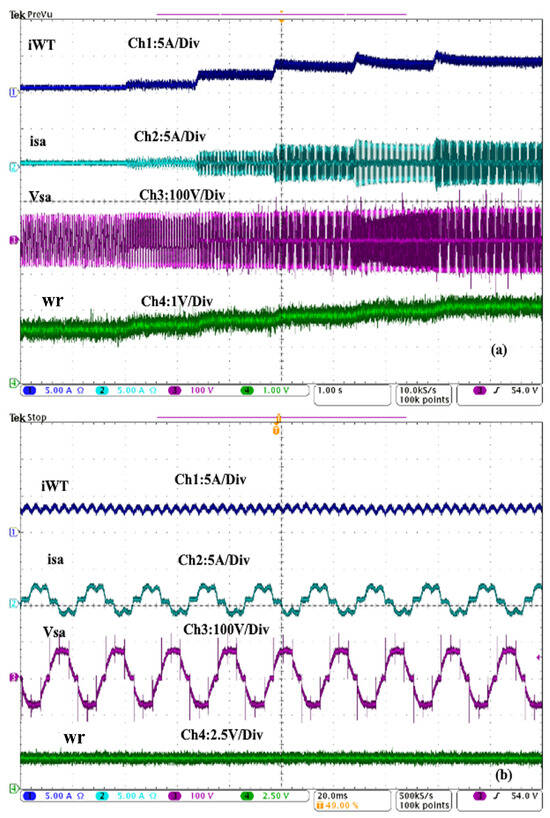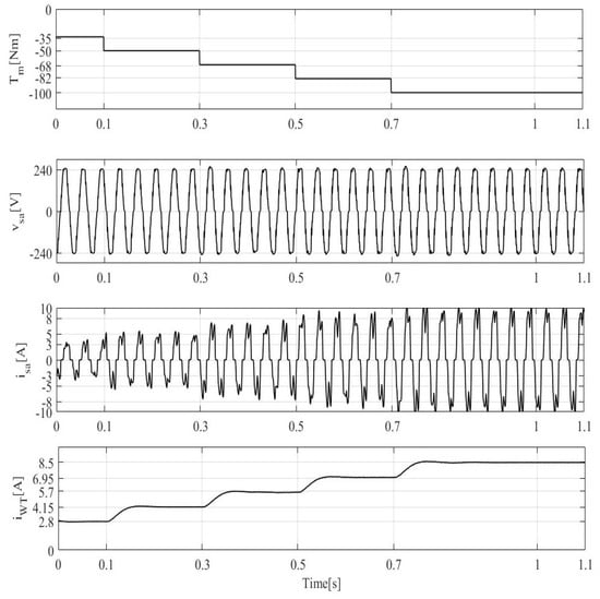 Figure 11 displays the measured DC current at the output of the TDB () and the dynamic performance of the rotor shaft torque (), voltage (), and current () of phase ‘a’ of the PMBLDCG. To test the proposed concept of achieving good efficiency from WT without using any MPPT technique, the system is subjected to wind speed variations at times of 0.1 s, 0.3 s, 0.5 s, and 0.7 s. A slight variation in the voltage is observed, but the current increases as the torque varies.