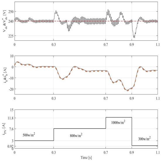 Dynamic performance without MPPT technique of DC-link voltage () and its reference (), battery current () and its reference (), and PV current () and solar irradiation change.