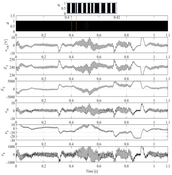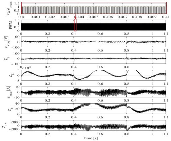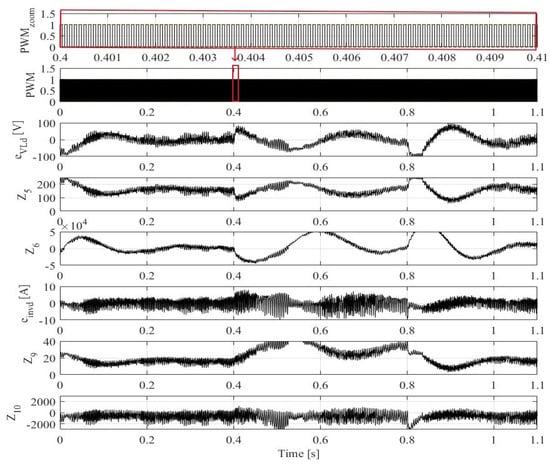 Dynamic performance of the LADRC controller LESO of the FBSPI in the d-axis: PWM and its zoom waveform between 0.4 s and 0.41 s (red box), the AC load voltage error () on the d-axis and its tracking () and disturbance () values, converter current error on the d-axis (), and its tracking () and the disturbance () values.