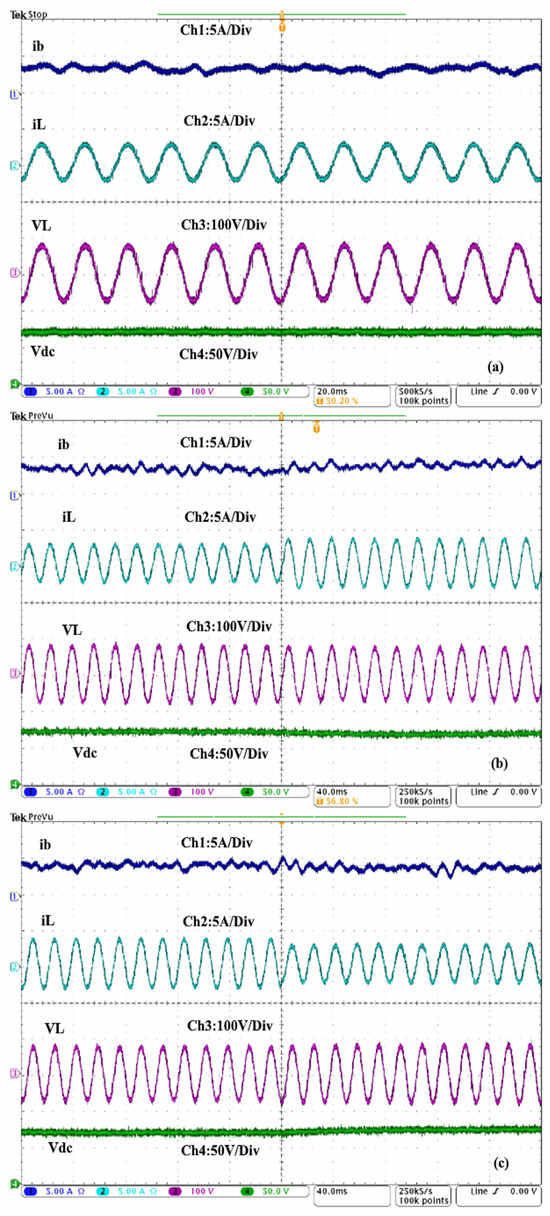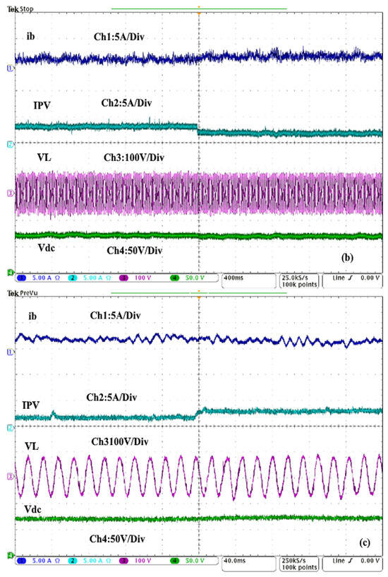Performance without MPPT technique of the ESS current (), PV current (), load voltage (), and DC link voltage () under sudden (a) increase in solar irradiation, (b) decrease in solar irradiation and (c) the zoomed waveforms of (a).