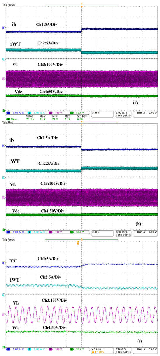 Performance without the MPPT technique of DC at the output of TDB (), battery current (), load voltage (), and DC link voltage () during (a) sudden increase, and (b) decrease in wind speed, and (c) the zoomed waveforms of (a).