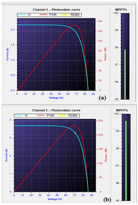 Figure 19a,b show the characteristics and when the system is subjected to 300 W/m2 and 700 W/m2, respectively. It is evident that when a system is exposed to high levels of solar radiation, one can obtain good efficiency, especially at the high level of irradiance from PVs without utilizing any MPP techniques.
