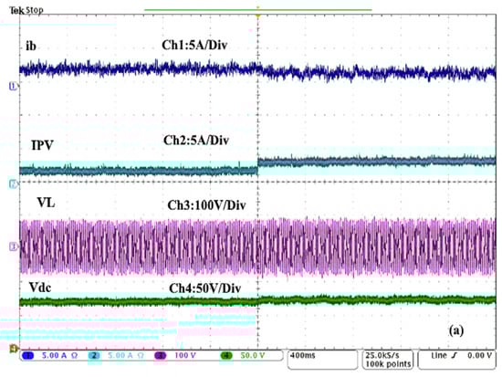 Figure 12 illustrates the waveforms of the DC-link voltage () and its reference (), the battery current () and its reference (), and the output PV current (). Tests are performed to evaluate the behavior of the proposed concept to achieve high performance from the PVs without using a tracking technique for the selected conditions as an ambient temperature of 25 °C at t = 0.3 s and t = 0.7 s. One see clearly that the output PVs current varies with the variation of the solar irradiation. One observes that, using the proposed concept, the efficiency decreases at a lower solar radiation (800 W/m2 and 500 W/m2), though it remains similar for high solar radiation (100 W/m2). During changes in solar irradiation at 0.33 s, 0.51 s, 0.57 s, and 0.7 s, and in changing wind speeds at 0.1 s, 0.33 s, 0.5 s, and 0.7 s, as well as in increasing and decreasing load at 0.4 s and 0.8 s, the DC-link voltage and battery current follow their references with a zero steady-state error and limited transient response during solar irradiation and wind speed change. One observes also that oscillations are less than 4%. As one can see, the battery balances the power by discharging from t = 0 to t = 0.2 s when PVs and WT generate less power, becoming zero from 0.2 to 0.3 s when the power delivered by WT and PVs equals the load demand. With increased solar radiation and wind speed, the battery begins charging in about 0.3 s to 1.1 s. While observing all these disturbances, it can be seen that the DC-link voltage is not affected and remains constant. The steady-state error confirms that the LADRC with the LESO in outer and inner control loops performs well.