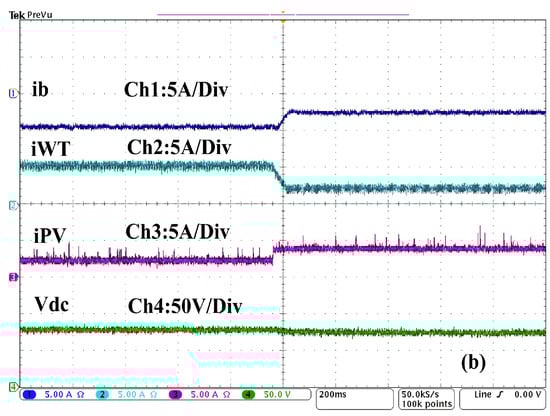 Figure 21a,b show the dynamic responses of battery current (), load current (), PCC voltage (), WT current (), PV current (), and DC-link voltage (). It is performed under fixed load, increasing solar irradiation, and decreasing wind speed. This demonstrates how the load is supplied with a fixed voltage and frequency under such severe conditions. The battery balances power in the system instantly, keeping the DC-link voltage constant without overshoots. Accordingly, the hybrid off-grid configuration’s decentralized control performs well under all operating conditions.