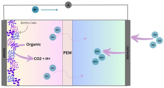 A fuel cell represents an electrochemical apparatus that directly transforms the inherent chemical energy within its reactants (fuel and oxidant) into electrical energy. Unlike batteries, a fuel cell operates as an energy converter, capable of generating continuous electric energy output, provided that the fuel and oxidant are consistently supplied in principle [6]. Like other fuel cells, MFCs can transfer chemical energy from wastewater into electricity by oxidizing carbohydrates to carbon dioxide (CO2) and allowing biochemical reduction to transport electrons [7]. Electrons and protons are generated in MFCs due to the degradation of substrates on the anode side. These electrons and protons are then transported through a resistor and a membrane to the cathode, reacting with oxygen to produce electricity [8,9].