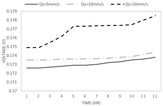 Before simulating the power generation for the wastewater treatment plant, several different pre-tests focusing on different parameters are generated using the MATLAB model to test the model and find the best model to maximize the power output. Moreover, to increase the accuracy of each test, the raw wastewater data applied for the pre-test is only for 1 L. The first test aims to find the relationship between inflow velocity and voltage output. The operational time for MFC is set as a constant of 12 h, and three different velocities are chosen as the variables, Qs equal to 5 mm∙s−1, 10 mm∙s−1 and 20 mm∙s−1.