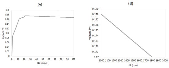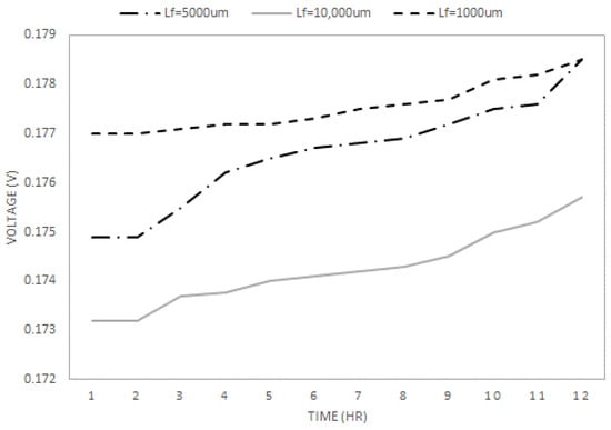 The second test applies constant Qs of 20 mm∙s−1 in the simulation to test the relationship between membrane thickness (Lf) and voltage output. Lf is chosen among 1000 µm, 5000 µm, and 10,000 µm. As shown in Figure 4, both the 1000 µm membrane and 5000 µm membrane lead to the highest voltage output of 0.1786 V, around 0.02 V higher than the 10,000 µm membrane. However, it can be seen that the start-up voltage of the 1000 µm membrane is much higher than the 5000 µm membrane, and it takes the 5000 µm membrane around 5 h to reach the same voltage output level as the 1000 µm membrane. Considering that, in reality, a shorter start-up time significantly increases the efficiency of the MFC system and helps increase the total voltage generation.