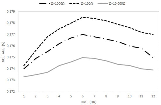 The final voltage generation difference between different internal resistances is not as significant as in the previous two tests, as shown in Figure 5. The maximum output ranges from 0.1745 to 0.1787 V, and 100 Ω has the highest voltage output of 0.1787 V. As mentioned previously, the case with the shortest start-up time is chosen to maximize the output when the maximum voltage output is similar.