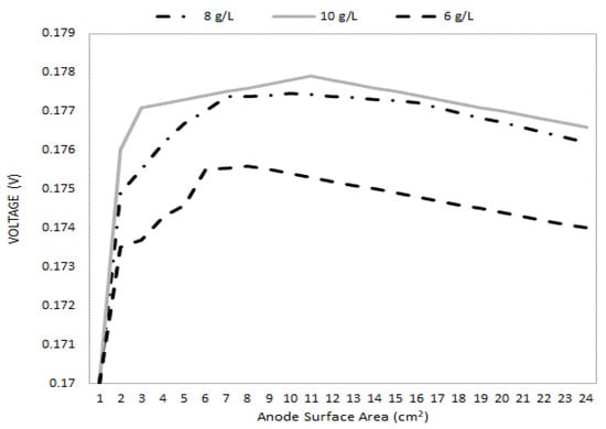 Voltage generation performance under different anode surface areas.