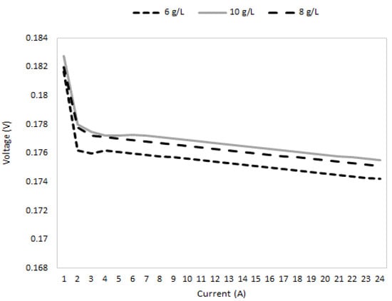 A study to examine how the feed concentration affects the electrical is also conducted. Three different substrates with different initial COD concentrations were examined in this test. According to the data presented in Figure 7, it is evident that feed concentrations in the lower range had a substantial impact on the generated power, specifically, when the feed concentrations were maintained within the lower range, a significant impact on the power output of MFCs was observed. This effect can be attributed to the availability of substrates for microbial metabolism [33]. At lower feed concentrations, the availability of organic matter as a substrate for bacterial oxidation may be limited, leading to reduced microbial activity and consequently lower power generation in MFCs. Therefore, maintaining optimal feed concentrations within the lower range is crucial for maximizing the power output and efficiency of MFC systems, as previously observed in studies by Wang et al. [33]. However, as the feed concentration increased into the higher range, the influence of feed concentration on power generation decreased.