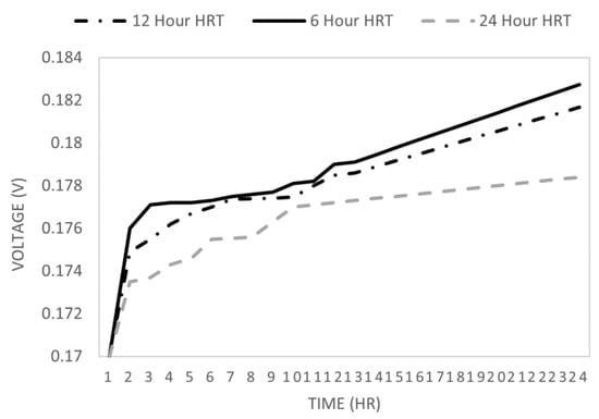 Three different HRTs were chosen as parallel simulations in Test 6. The cell voltage rises as the hydraulic retention time (HRT) decreases. This is because a shorter HRT boosts microbial fuel cell (MFC) power generation by removing non-exoelectrogenic microorganisms. As these non-exoelectrogens are flushed out, more organic matter becomes available for exoelectrogenic bacteria to utilize in power generation. Conversely, exoelectrogenic bacteria may also be washed away when the HRT is longer, resulting in reduced power generation, as shown in Figure 8.