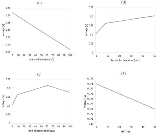 Feed concentration directly affects voltage output in microbial fuel cells (MFCs) by influencing the availability of electron donors and acceptors. Higher concentrations increase microbial activity, enhancing electron transfer processes and voltage generation. However, as shown in Figure 9E, the impact on the voltage output will be negative when the initial concentration is overly high. HRT also negatively impacts voltage output. This is because a shorter HRT enhances power generation in microbial fuel cells by eliminating non-exoelectrogenic microorganisms.