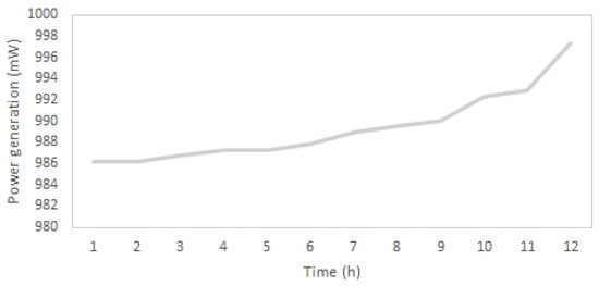 The final simulation gives a maximum power generation of 998 mW in 12 h for 1 L of wastewater shown in Figure 10. Since the daily inflow of the wastewater in the treatment plant is 50.651 MLD [10], the total power generation for the Guelph wastewater treatment plant could reach 50,515.16 kWh per day by implementing testing data into Equation (11).