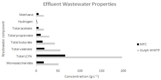 By comparing the effluent component concentration and the influent concentration, the Guelph wastewater treatment plant has a COD removal rate of around 25%. In comparison, MFCs have a COD removal rate of around 75%. (g∙L−1).