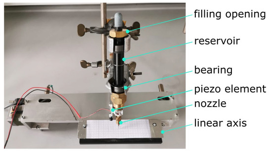The structure of the VAPF consists of a tube that stores powder and is mounted on damping elements. The filler neck where the powder is introduced is located at the upper end of the tube. In the lower section, a piezo element is located close to the nozzle, which can be triggered to vibrate via alternating voltage. When this voltage is applied, powder flows out of the nozzle tip during transitions. Figure 2 shows an example of a powder trail deposited on graph paper.