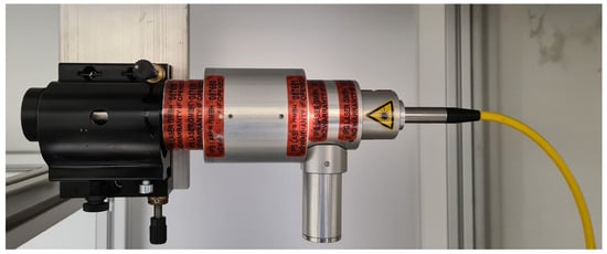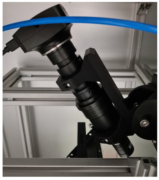 A camera system was developed to visually analyze the process or the process action point (Figure 7). A Bresser MikroCam II microscope camera was combined with a magnifying lens and a Thorlabs FBH400-40 bandpass filter (Thorlabs, Inc., Newton, NJ, USA) (400 nm ± 20 nm). Among other wavelengths, the bandpass filter filters out the wavelengths of the laser and the blackbody radiation to prevent overexposure at the process site. Two UV lamps (395 nm) were used for illumination.