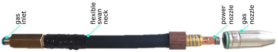 To ensure a laminar flow of the shield gas, the system applies the long-established principle and design of a welding torch (Figure 5). A flexible torch neck was selected in order to enable slight adjustment of the position in the assembled state. The contact tip in the front area of the shield gas supply was closed with a cylinder screw to avoid negative influence on the flow. An adapter for a plug connection, which in turn serves to hold the gas-conveying hose, was fitted to the rear part of the supply.