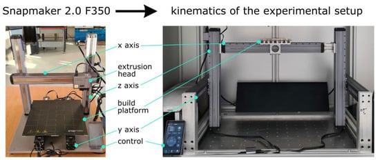 As no kinematics could be realized with existing components, a suitable and economically favorable solution was found by adjusting the existing Snapmaker 2.0 F350 MEX (Snapmaker, Shenzhen, China) printer (Figure 6). The axes are operated in close proximity to the laser and metallic powder. Hence, the closed all-metal axes with integrated stepper motors and spindle drive are particularly advantageous.